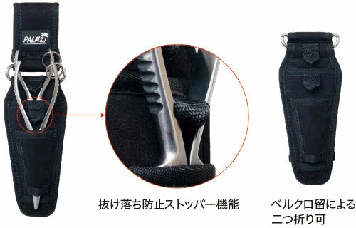 A holder that can store two pliers with two through pockets. Each stopper is designed to prevent it from coming off. The joint part breaks when you sit down when you fasten it to your waist belt, so there is no push-up due to unpleasant scratches. The soft-touch is also attractive.