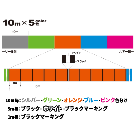 | Size | PE1.5 5COLOR 13.5Kg (0.209mm), PE2.5 5COLOR 20.0Kg (0.270mm), PE3.0 5COLOR 23.0Kg (0.296mm) |
