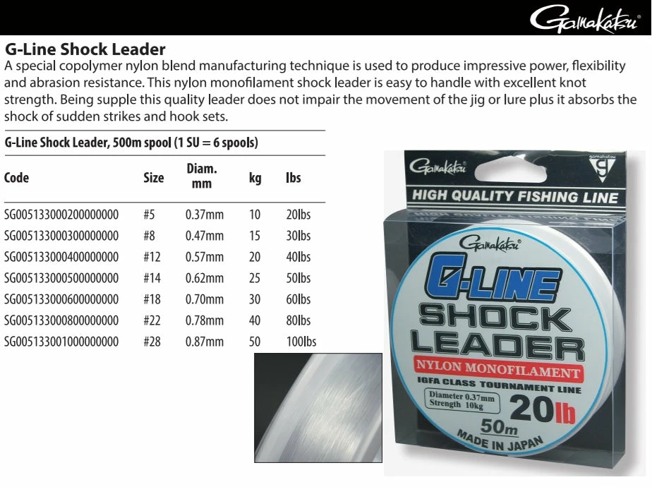 The G-Line monofilament shock leader is easy to use and offers excellent knot strength. Extremely supple enough to present baits in the most natural way.