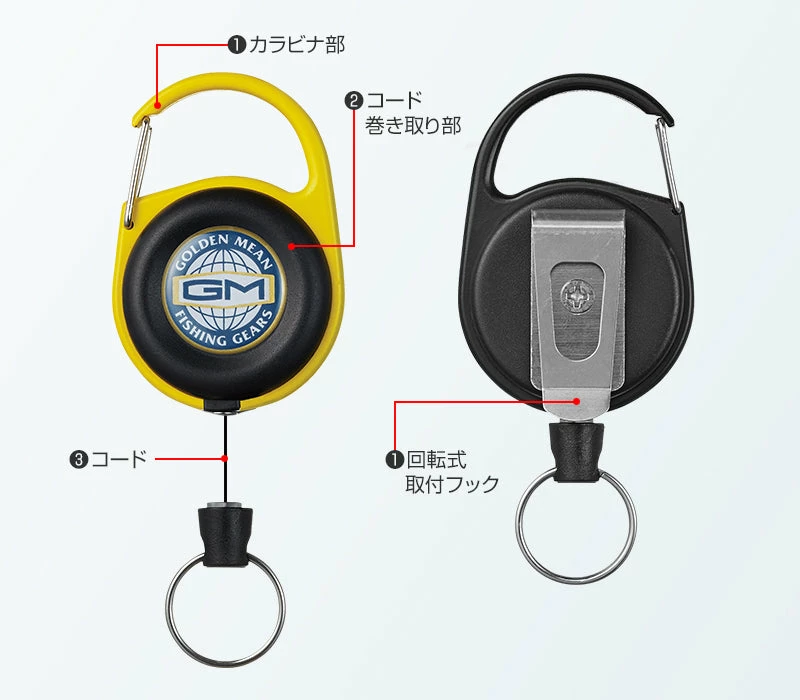 The “GM Pin-on-Reel Big” is a large pin-on reel with an integrated carabiner that has a 100cm cord length. The carabiner and the mounting hook on the back can be installed in various places. A must have tool to attach split ring plier, line cutter etc for convenience access to it during fishing.