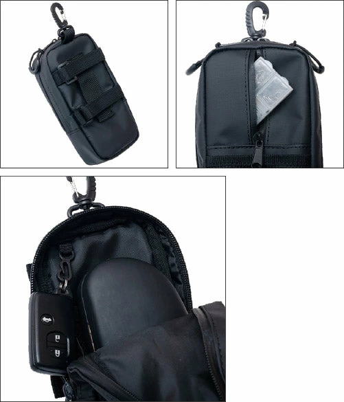 The slightly long tarpaulin pouch is a perfect size to store polarized glasses together with the case. Designed with a front mesh pocket, a vertical storage mini pocket, an inner mesh pocket, and a key hanger hook. Equipped with a vertical and horizontal back velcro tape that can be attached to both the waist belt and shoulder belt.
