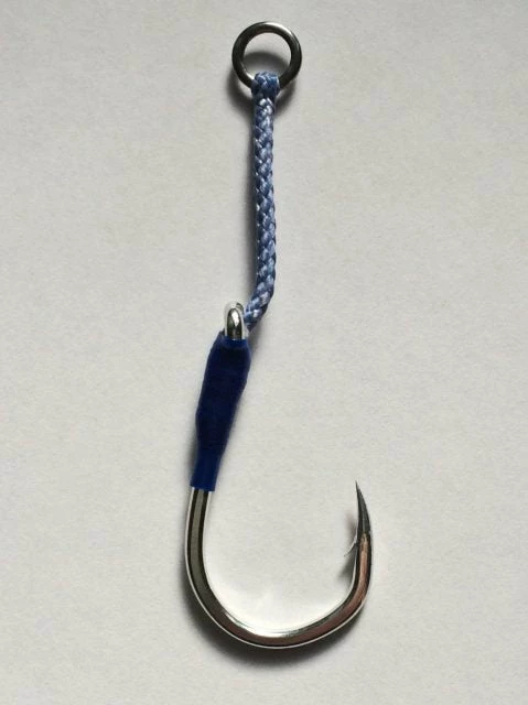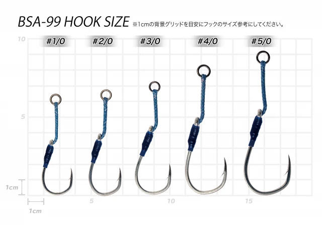 Single assist using Blue Backs Shot hook, BBS-88. Strong PE line is used for this BSA-99, realizing the best hooking performance by each length with its hook size. Target Fish: Not only large blue fish but also Tuna.